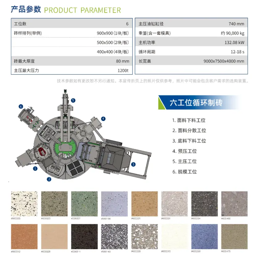 Ekipamenduaren presio nagusiak diametro handiko trantsizio-olio depositua betetzeko gailu bat hartzen du, azkar erantzuteko, sentikortasunez mugitzeko eta 1.200 tona presio ateratzeko. Estazio hidraulikoak ponpa aldakorra hartzen du, abiadura eta presioa balbula proportzional baten bidez doitzen dituena, energia aurrezteko eta funtzionatzeko erraza dena. Biraka-plakak birakatze oso handia hartzen du, kodegailudun motor serbo batek kontrolatzen duena, eta funtzionamendu egonkorra eta kontrol zehatza ditu. Aldi berean, ikusizko kontrol sistema aurreratu bat hartzen du eta PLCak Siemens S7-1500 seriea hartzen du. Materiala deskargatzeko gailuak irabiatzeko gailu bat dauka eta deskargatzeko mahai birakaria kuantitatibo bat erabiltzen da eta material kantitatea zehatza eta egonkorra da.